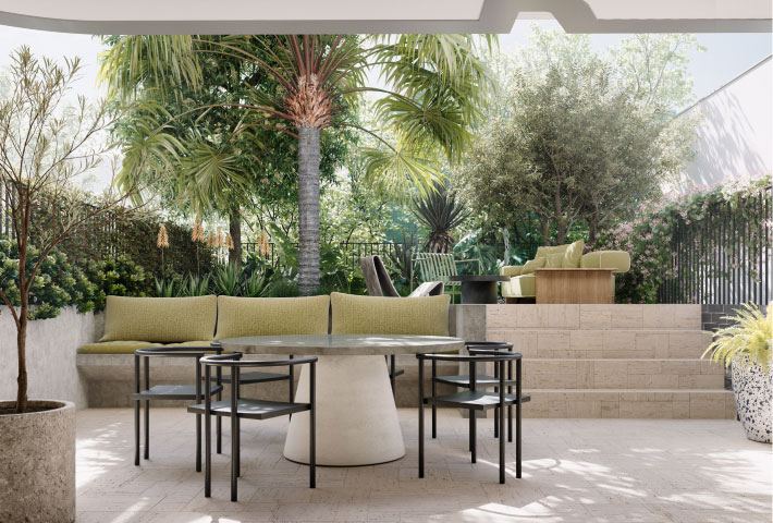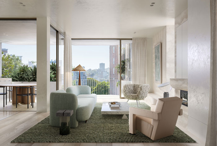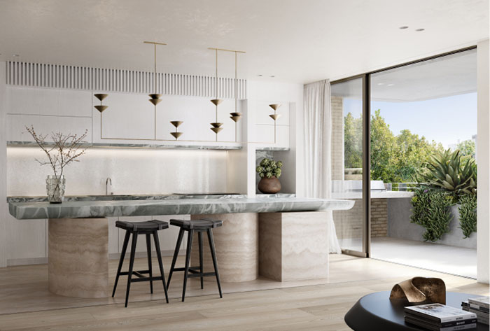 The interior design by Fiona Lynch, Vogue Living Interior Designer of the Year 2024, nods to Art Deco influences in a contemporary fashion and is consistent across all three apartments. Every touchpoint throughout the apartments has been carefully considered, such as the use of multiple stone finishes and bespoke joinery.