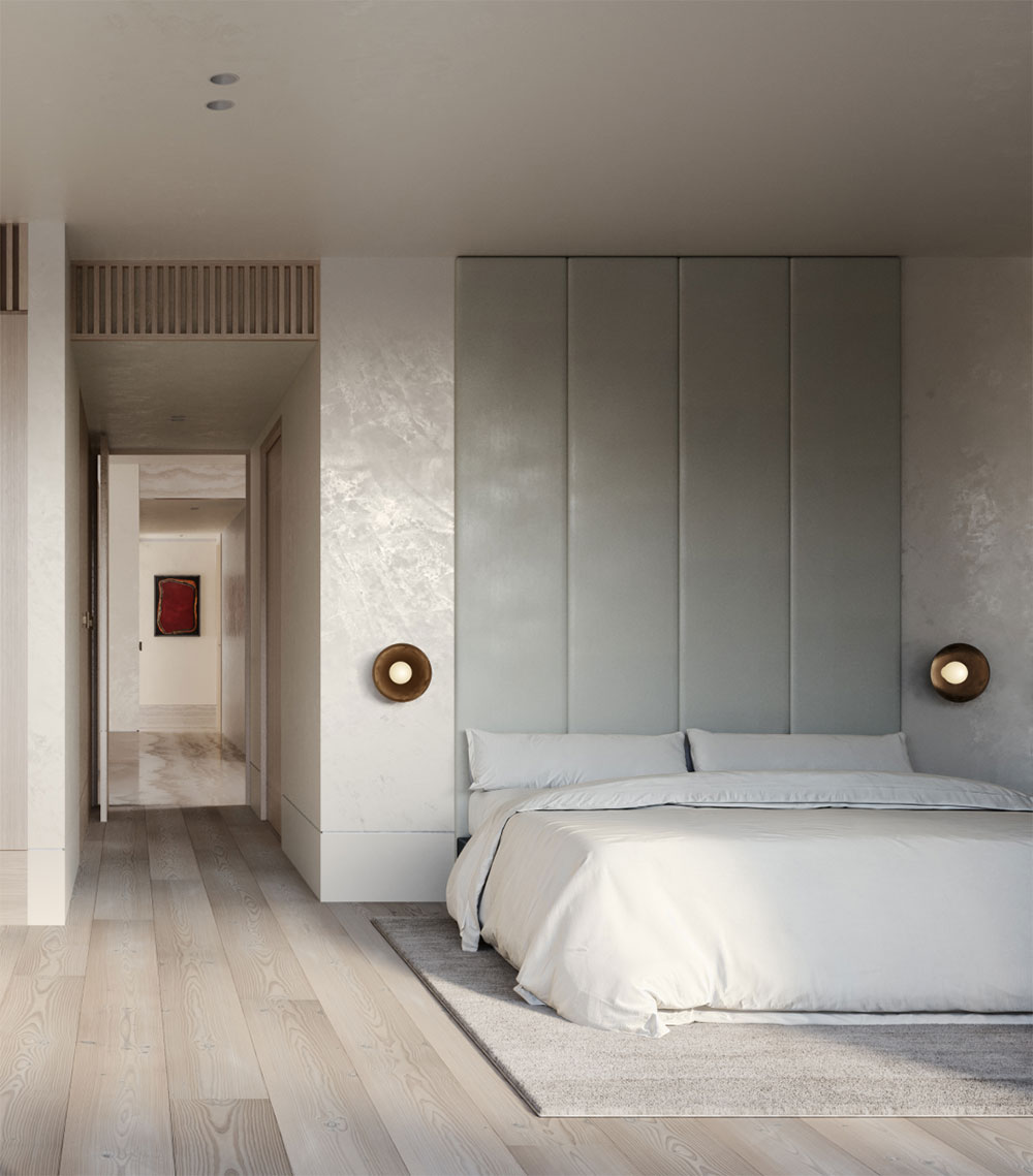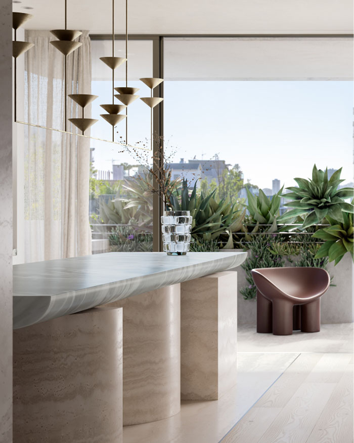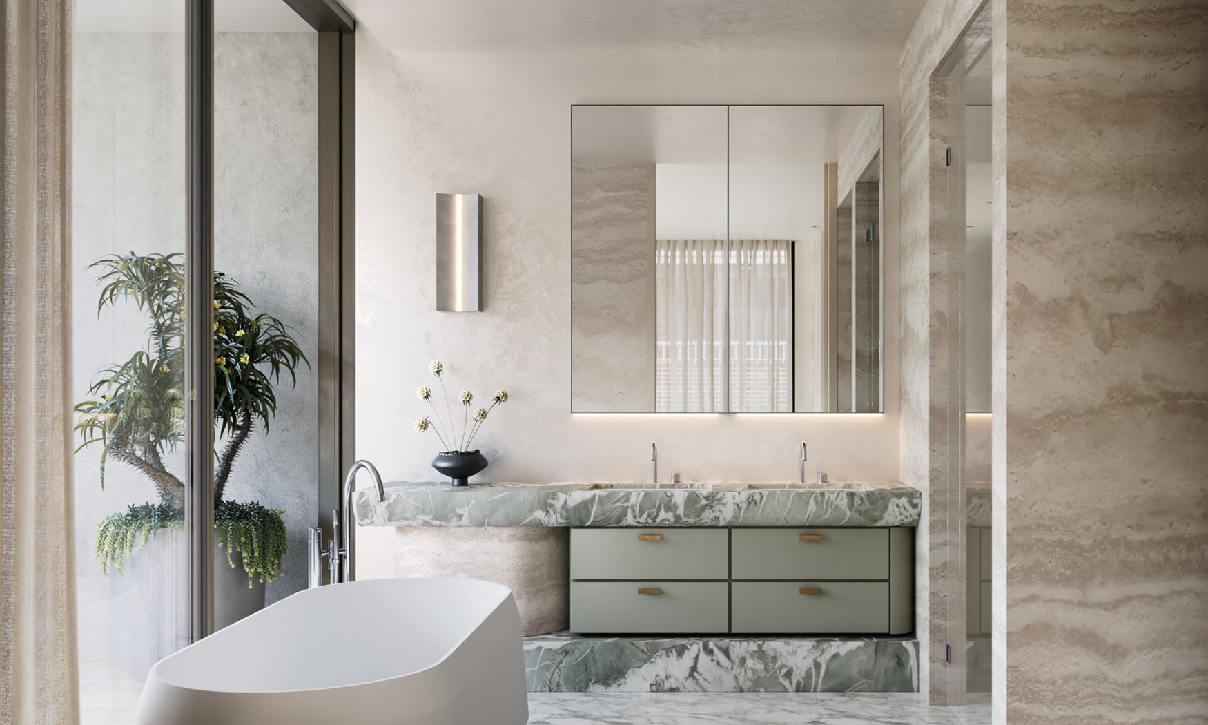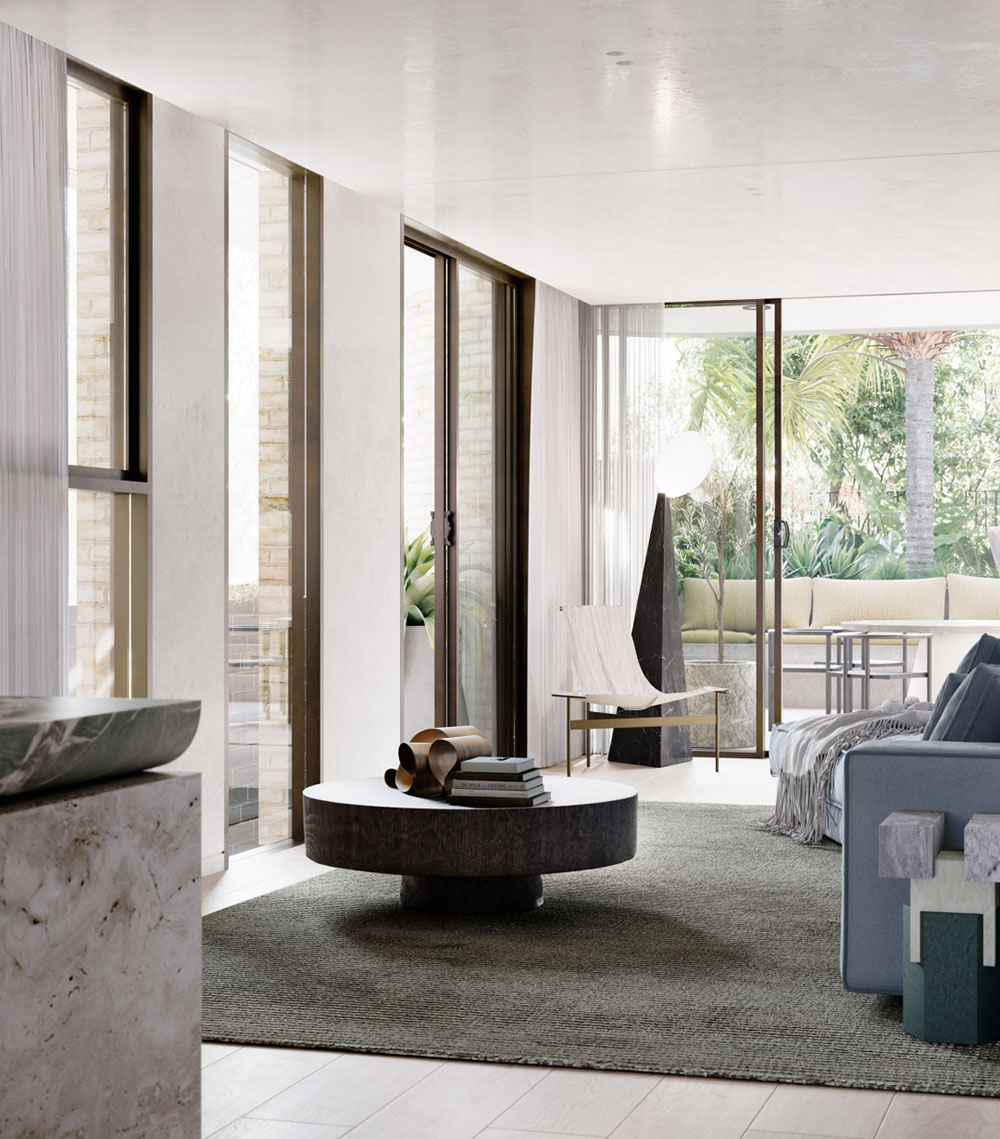 The interior design by Fiona Lynch, Vogue Living Interior Designer of the Year 2024, nods to Art Deco influences in a contemporary fashion and is consistent across all three apartments. Every touchpoint throughout the apartments has been carefully considered, such as the use of multiple stone finishes and bespoke joinery.
